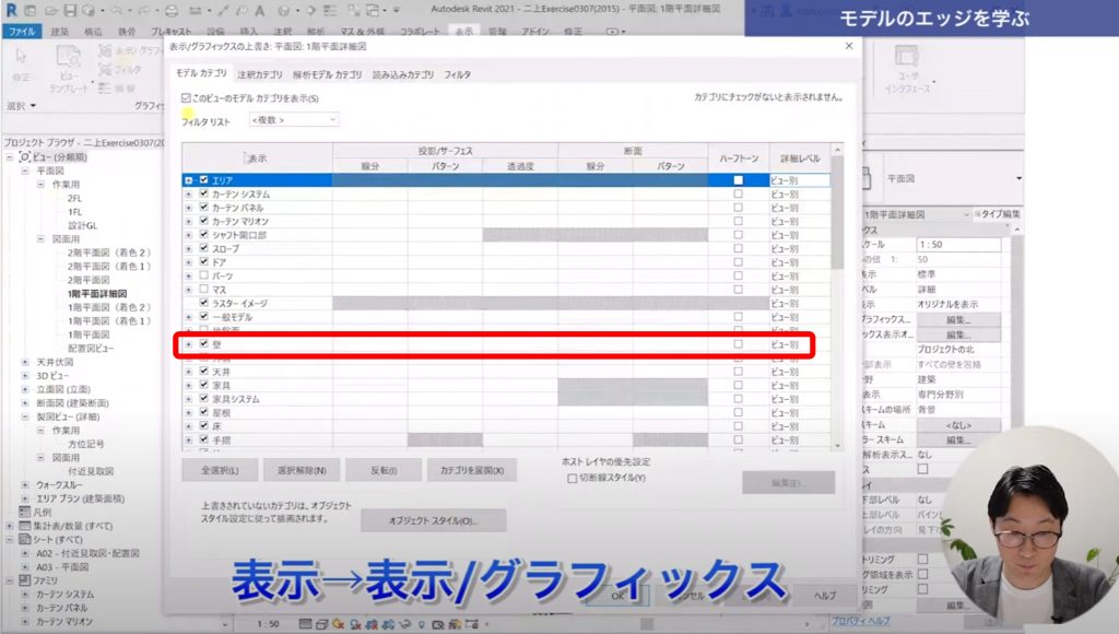 先ほどのフィルタは壁-LGSに上書きしたため、ビューでは壁-LGSのみ上書きされています。(壁のエッジが黄色に上書きされています)