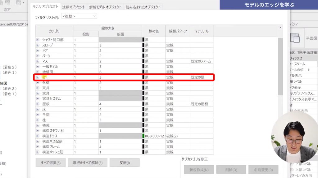 今回はこの【オブジェクトスタイル】で、壁の線の色を赤色に変更してみます。