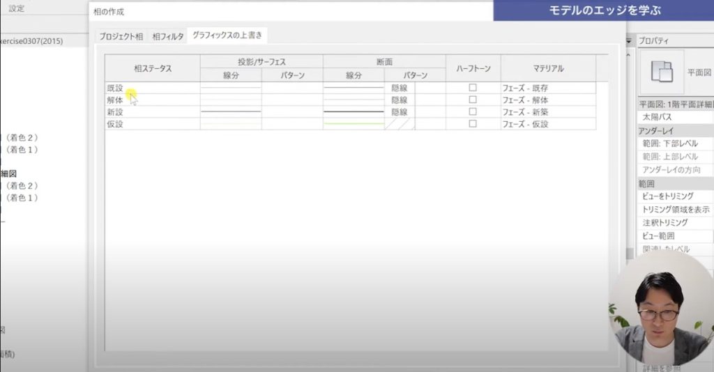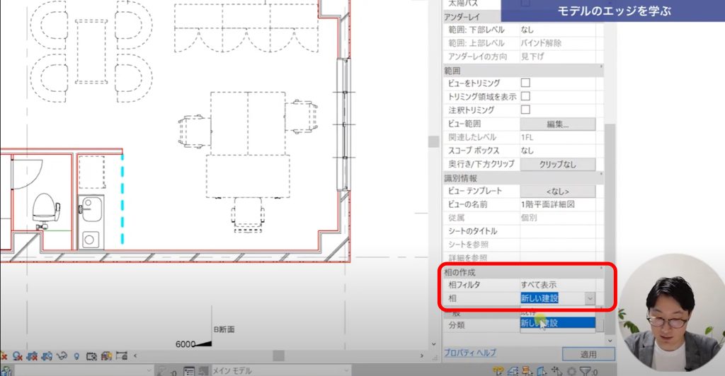ビューのプロパティパレットの下の方にフェーズの作成(動画では相と誤訳されています)があります。